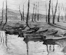 Un silenzio quasi metafisico, intriso di solitudine, e di nostalgia, permea talune composizioni di barche in riposo e “Spiaggia”.
