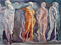 I grigi e i verdini di Mataloni diventano rosati, un pallido corallo trascorre sulle figure.