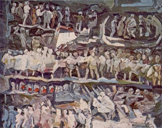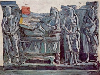 Mi riferisco ai quadri dal titolo “Frammento di una fuga” (i due eroi scavati nel marmo come dentro un’atmosfera ventosa, sono riscaldati nelle guance; e quei visi di tensione fanno già i conti con l’aria aperta, sono dentro un vento “fisico” niente affatto simulacri del tempo), “Scena a due piani” e “Dalla colonna Traiana”, dove è evidente la ricognizione di comparse di marmo per una recita.