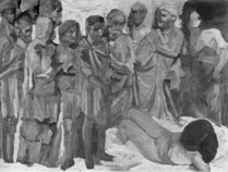 E’ singolare il quadro perché si assiste in esso ad una più tesa differenza tra antico ed attuale, anzi fra archeologia ed attimo fuggente: da una parte molte figure “scolpite” e ridipinte in quei grigi e verdini e biacche del Mataloni paesista di folle romane, dall’altra, stretto fra le figure di marmo, questo esplodente fratello-postero, dipinto “come un vivo”. Perché? E’ l’unico valido del gruppo, oppure è una inammissibile eccezione, che sottolinea l’immutabilità del gruppo, di questo clan della immortalità?