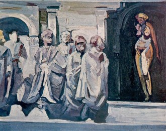 Ma questa animazione della scultura antica per essere “vista” in un’altra ribalta (fuori del museo e fuori dell’originaria destinazione), questa “seconda vita” di personaggi per virtù impressionista, assume varie cadenze e soluzioni nell’arte del nostro pittore. Vi sono momenti in cui l’artista muove la scena “antica” evidenziandone a tutta cromia un particolare, quasi che in quel punto il bassorilievo si stesse svolgendo una metamorfosi dalla pietra alla carne.